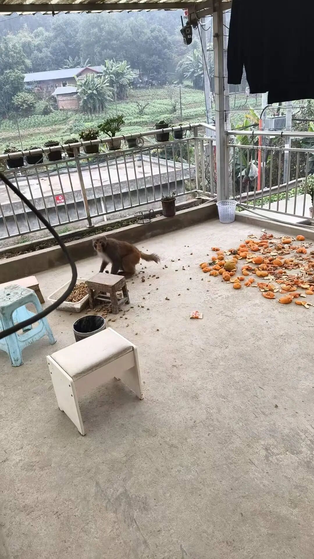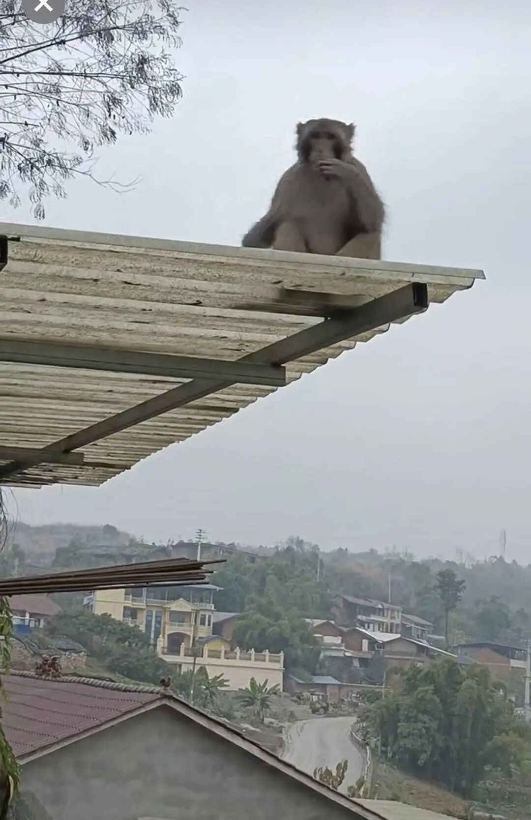 随后,“猴哥”的身影现身隔壁的高山镇马塘村,骑在村民院子墙上观望。后来又出现在清水寺村,在村里的光缆线上行走。在村民们拍下的视频、照片中,这只“猴哥”还在村民的院子里溜达,坐在雨棚上啃食花生,在山坡上眺望休憩。
