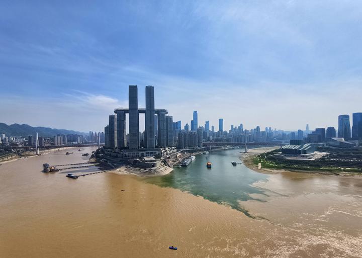 近日,随着汛期的到来,重庆市朝天门码头长江与嘉陵江交汇处出现了泾渭分明的“鸳鸯锅”景象。这一现象通常出现在每年的汛期,多由于长江上游或嘉陵江上游地区发生降雨所致。(视频拍摄:郭旭)